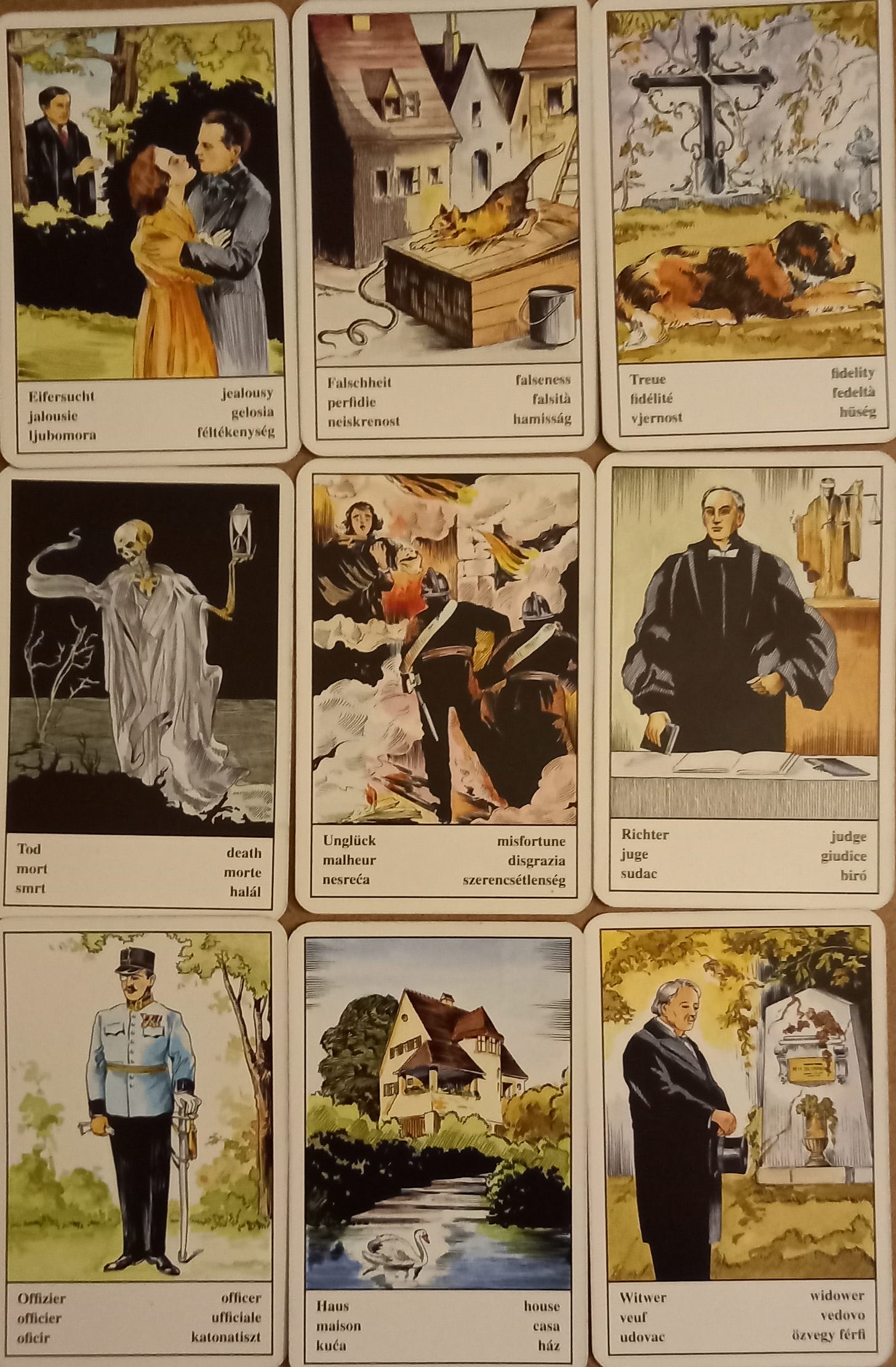 We’re using Piatnik’s 1901 Traditional Zigeuner “Gypsy” Fortune Telling Cards, which are kind of an offshoot of the Vera Sibilla, and a precursor to the Kipper.