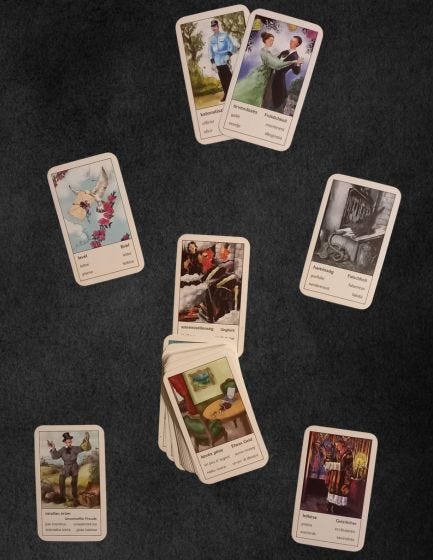 So for today’s reading, I’m using the Star Spread with the Hungarian Bohemian cards to take a look at what he’d have to do to achieve some semblance of order in his governance, in the way he’d like. I’m representing this with the Officer and Merriment cards together - a sort of “positive authority”. I’ve also included both a central problem card (Misfortune) and an underlying.